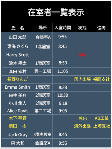 在室者だけを表示する「在室者表示」・在籍者全員を表示する「在籍者一覧表示」などご要望の管理によって選択できます。